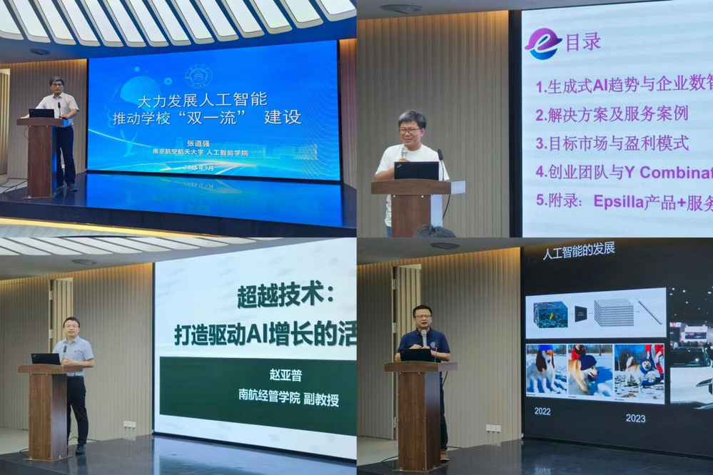 在交流分享环节,张道强围绕学校人工智能学科发展、科研成果及产学研合作情况进行了详细介绍;校友杨森结合自身的创业实践为在场校友提供了路径参考;经管学院副教授赵亚普聚焦人工智能在企业管理中的应用与商业模式创新进行分享;校友管震介绍了如何充分利用人工智能赋能企业管理和生产的创新实践。